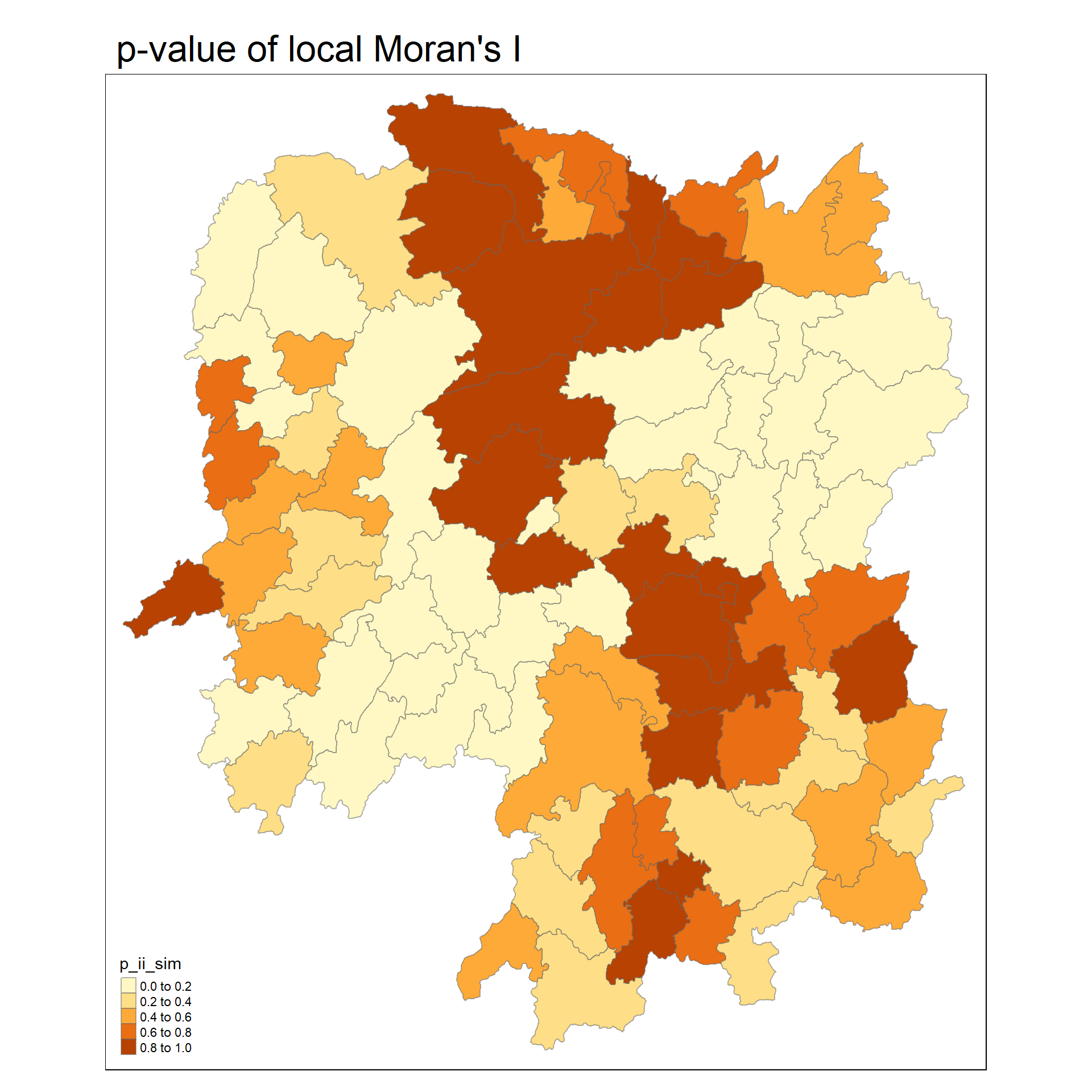 Moran I statistic standard deviate = 4.7351, p-value = 1.095e-06
