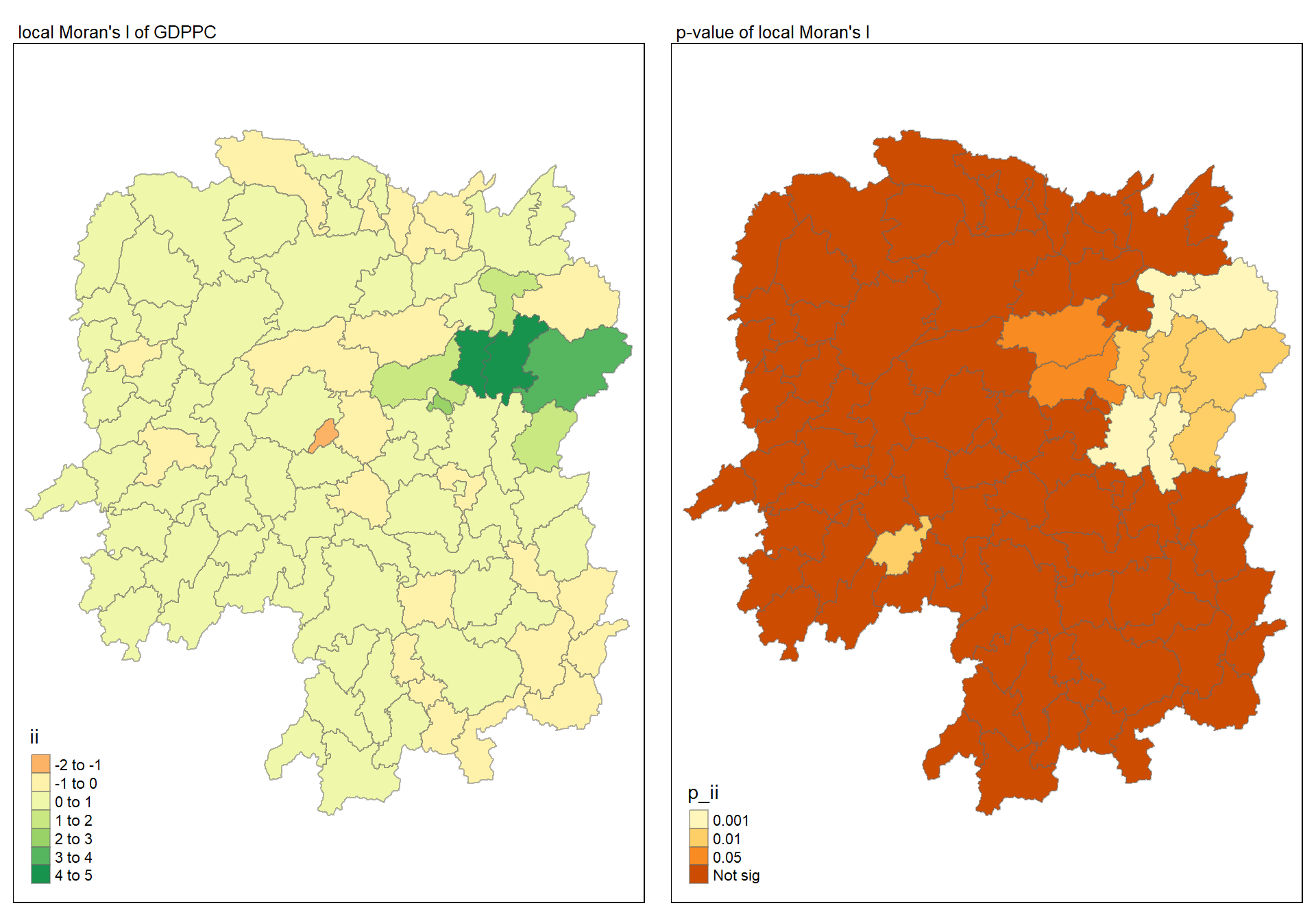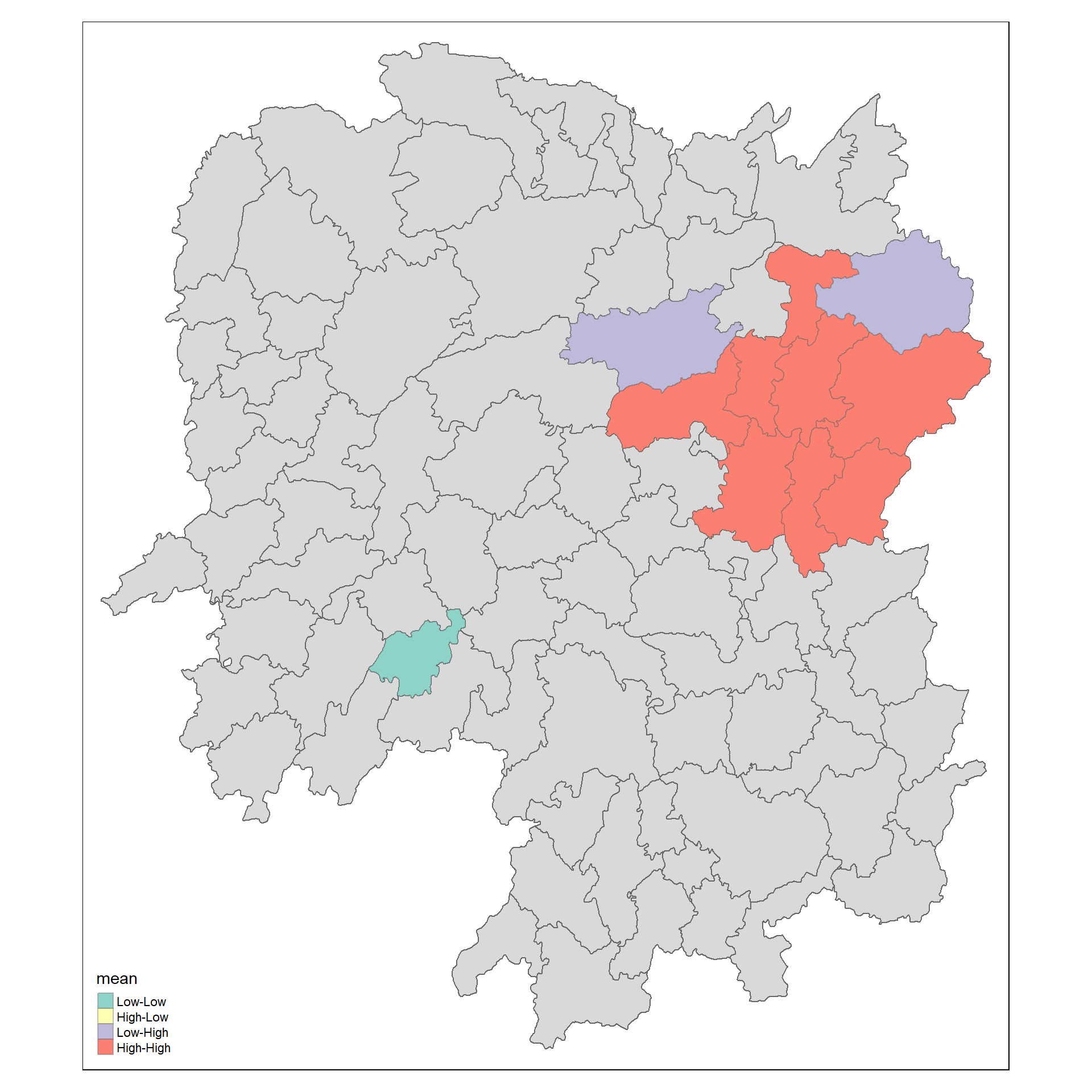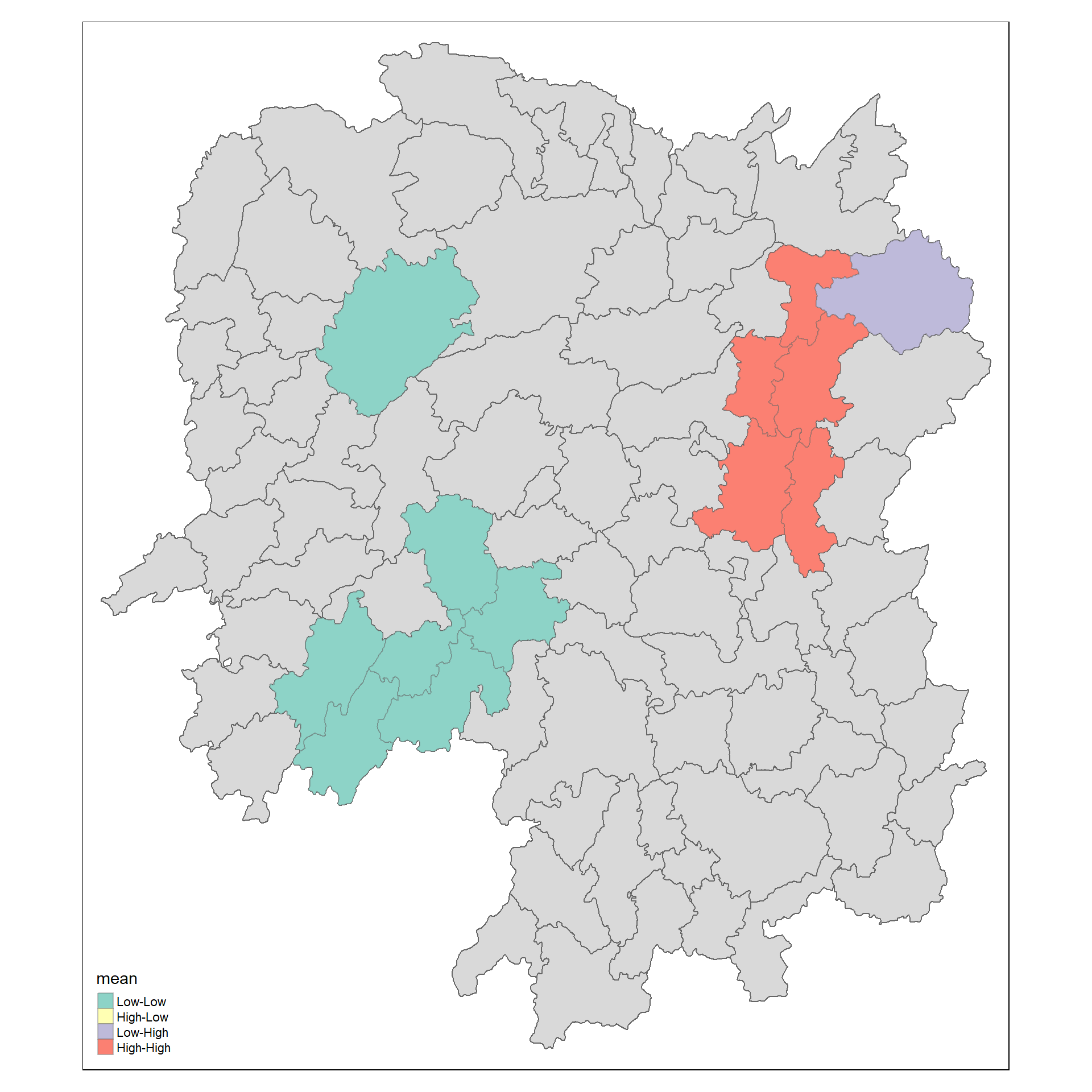 LISA map is a categorical map showing outliers and clusters. There are two types of outliers namely: High-Low and Low-High outliers. Likewise, there are two type of clusters namely: High-High and Low-Low cluaters. In fact, LISA map is an interpreted map by combining local Moran’s I of geographical areas and their respective p-values.