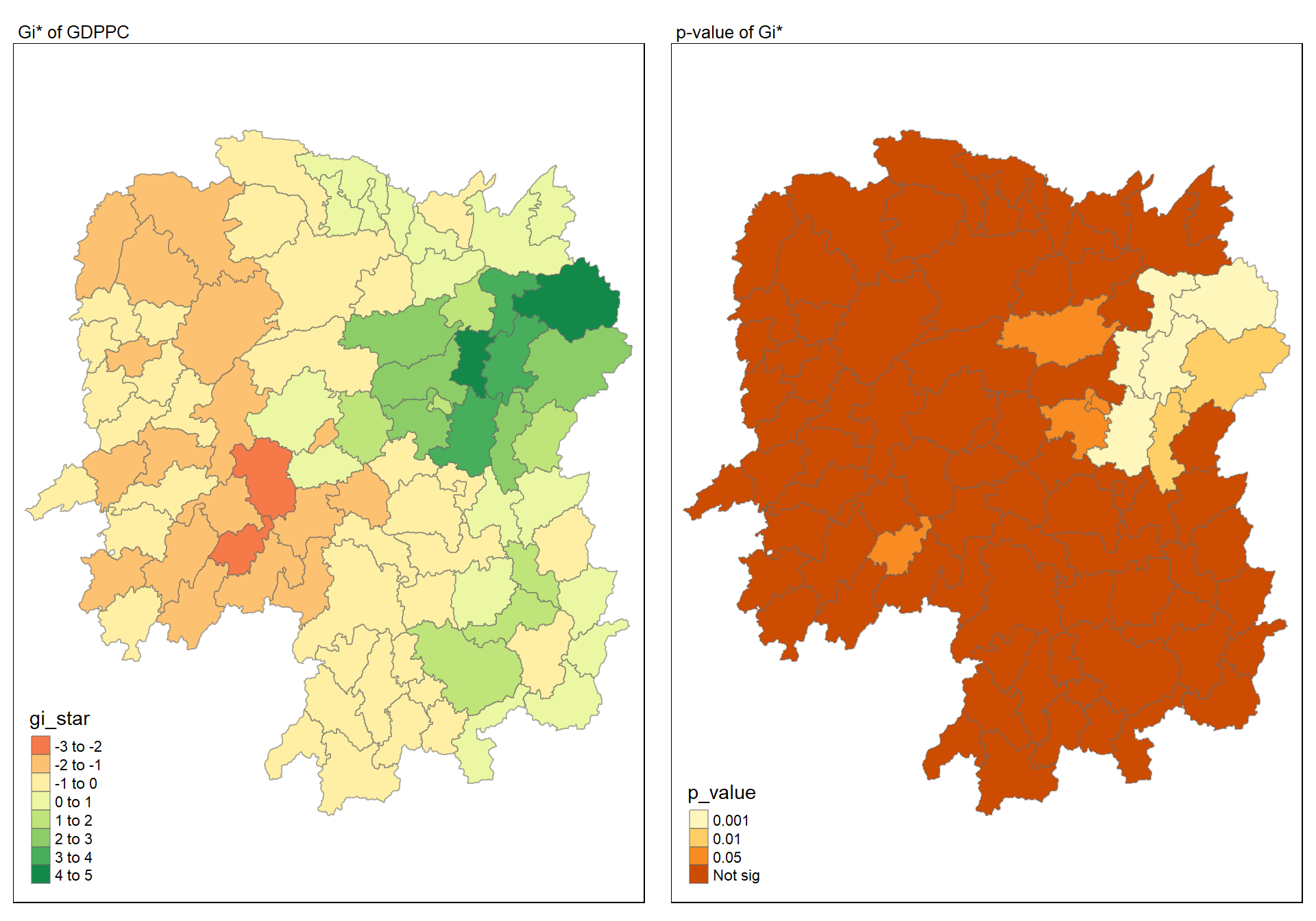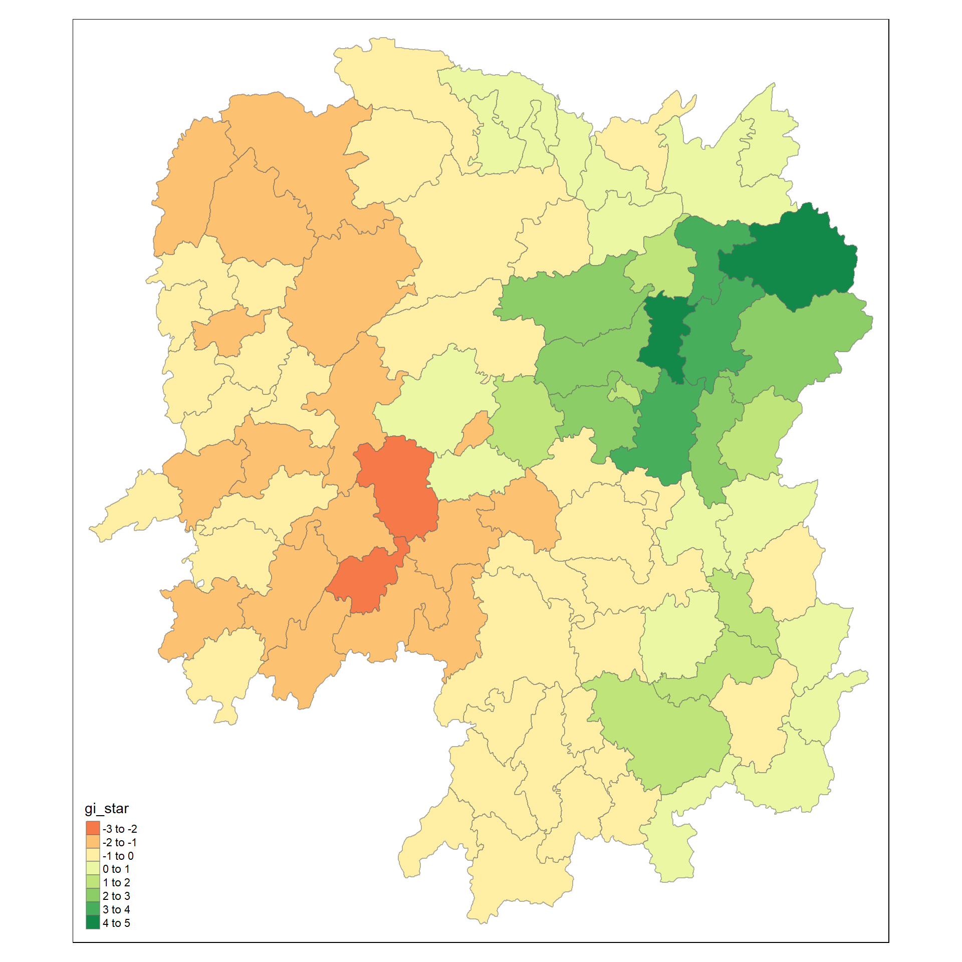 Figure above reveals that there is one hot spot area and two cold spot areas. Interestingly, the hot spot areas coincide with the High-high cluster identifies by using local Moran’s I method in the earlier sub-section.
