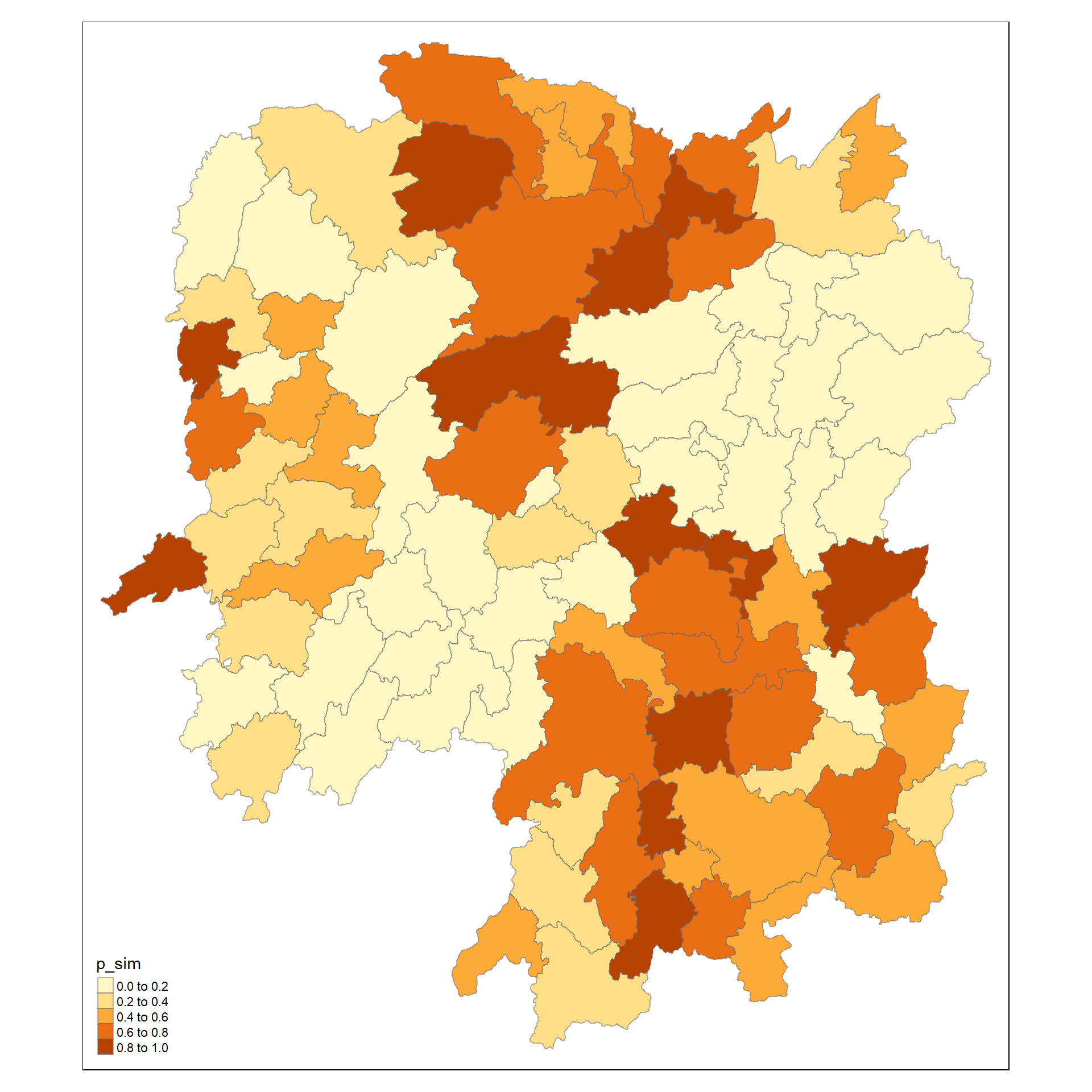 The output of local_moran() is a sf data.frame containing the columns ii, eii, var_ii, z_ii, p_ii, p_ii_sim, and p_folded_sim.