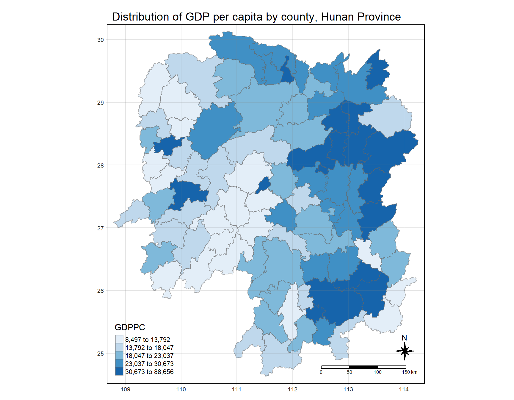tm_layout(main.title = "Distribution of GDP per capita by county, Hunan Province",