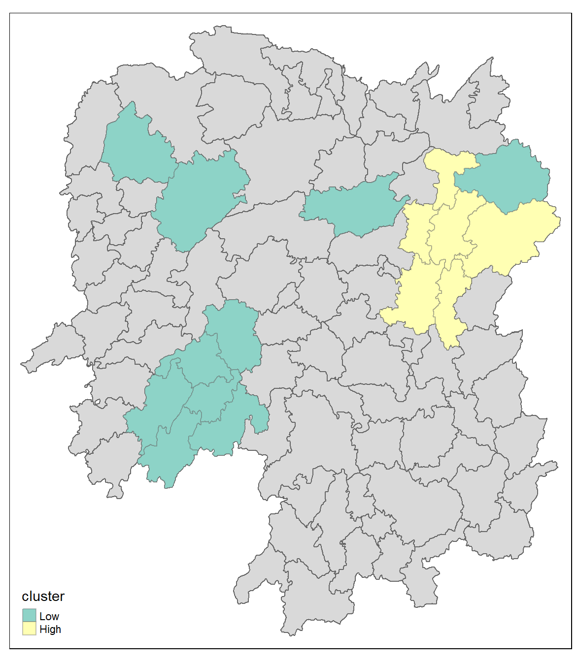 The statistical report on previous tab shows that the p-value is smaller than alpha value of 0.05. Hence, we have enough statistical evidence to reject the null hypothesis that the spatial distribution of GPD per capita are resemble random distribution (i.e. independent from spatial). Because the Moran’s I statistics is greater than 0. We can infer that the spatial distribution shows sign of clustering.
